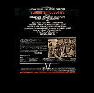 The transfer is wonderful. The film is shot very neutral and plain but when something important is displayed, like the blood on Billy's face after the plane crash or the fires of Dresden after the bombing. The audio is full and well presented. I was shocked to hear the bass which is present at the end of side 2 during the orchestral movements. Replication is very clean as well, with only minor speckling present. The side breaks chosen by DiscoVision are interesting in that the first two sides are crammed full, with sides 3 & 4 running only 45 minutes total. Still, there are no tracking difficulties or laserlock present.