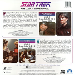 | Stardate 44356.9 When the Enterprise encounters a cluster of nearly invisible two-dimensional creatures, the ship is pulled inexplicably through space. While Counselor Diana Troi (Marina Sirtis) is being consulted about the nature of the phenomenon, she suddenly discovers that she has completely lost her empathic abilities. Troi attempts to continue her duties, but finds she cannot be effective without access to the emotions of others. Despite efforts by crew members to reassure her, she submits her resignation to Captain Picard (Patrick Stewart). Meanwhile, it's discovered that the Enterprise is being pulled toward a cosmic string fragment - the equivalent of a small black hole - and, if the ship cannot break free in time, it will be torn apart by immense gravitational forces. | |