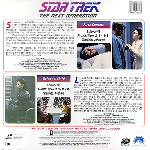 | Stardate 44614.6 Lt. Commander Geordi LaForge (LeVar Burton) is thrilled at the prospect of finally meeting Dr. Leah Brahms (Susan Gibney), whose holodeck image he once fell in love with. But Geordi's romantic expectations are crushed when she comes aboard with a cold demeanor and a highly critical attitude. Meanwhile, the discovery of a new alien life-form ends tragically when the creature is accidentally killed. When the remorseful crew realizes that the entity was pregnant, Picard (Patrick Stewart) employs the ship's phasers to perform a cesarean section. Unfortunately, the newborn latches onto the Enterprise and starts to drain energy from what it believes is its mother. The crisis mounts when an attempt at removing the baby attracts adult aliens from their natural asteroid field. As the energy drain reaches critical levels, Geordi and Brahms try to rise above their friction to release the alien child and save the Enterprise. | |