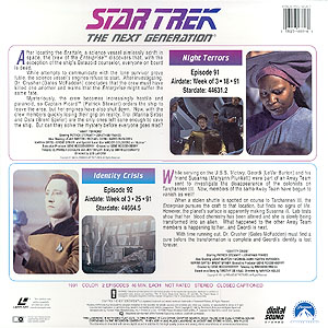 | Stardate 44614.6 While serving on the U.S.S. Victory, Geordi (LeVar Burton) and his friend Susanna (Maryann Plunkett) were part of an Away Team sent to investigate the disappearance of the colonists on Tarchannen III. Now, the members of the same Away Team have begun to vanish as well! When a stolen shuttle is spotted on course to Tarchannen III, the Enterprise pursues the craft to that location, but finds no signs of life. However, the planet's surface is apparently making Susanna ill. Lab tests show that her blood chemistry has been altered and she is slowly being transformed into an alien. What happened to the other Away Team members is happening to her...and Geordi is next. With time running out, Dr. Crusher (Gates McFadden) must find a cure before the transformation is complete and Geordi's identity is lost forever. | |