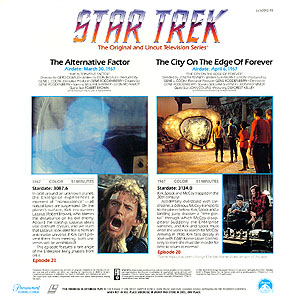 | Stardate 3134.0 Kirk, Spock and McCoy trapped in the 20th century! Accidentally overdosed with cordrazine, a delirious McCoy (DeForest Kelley) transports to the planet below. Kirk (William Shatner), Spock (Leonard Nimoy) and a landing party discover a "time portal" through which McCoy disappears! Suddenly the Enterprise vanishes, and Kirk and Spock must enter the vortex to search for McCoy. Arriving in 1930, Kirk falls deeply in love with Edith Keeler (Joan Collins), only to learn she must die in order for time to return to normal! Some music has been changed for the Home Video version of this episode. | |