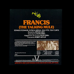 Francis (The Talking Mule) was reissued on LaserDisc by MCA/Universal Home Video (Catalog #: 42024) as part of an Encore Edition Double Feature with Francis Goes to the Races. The double feature was released in May 1994.